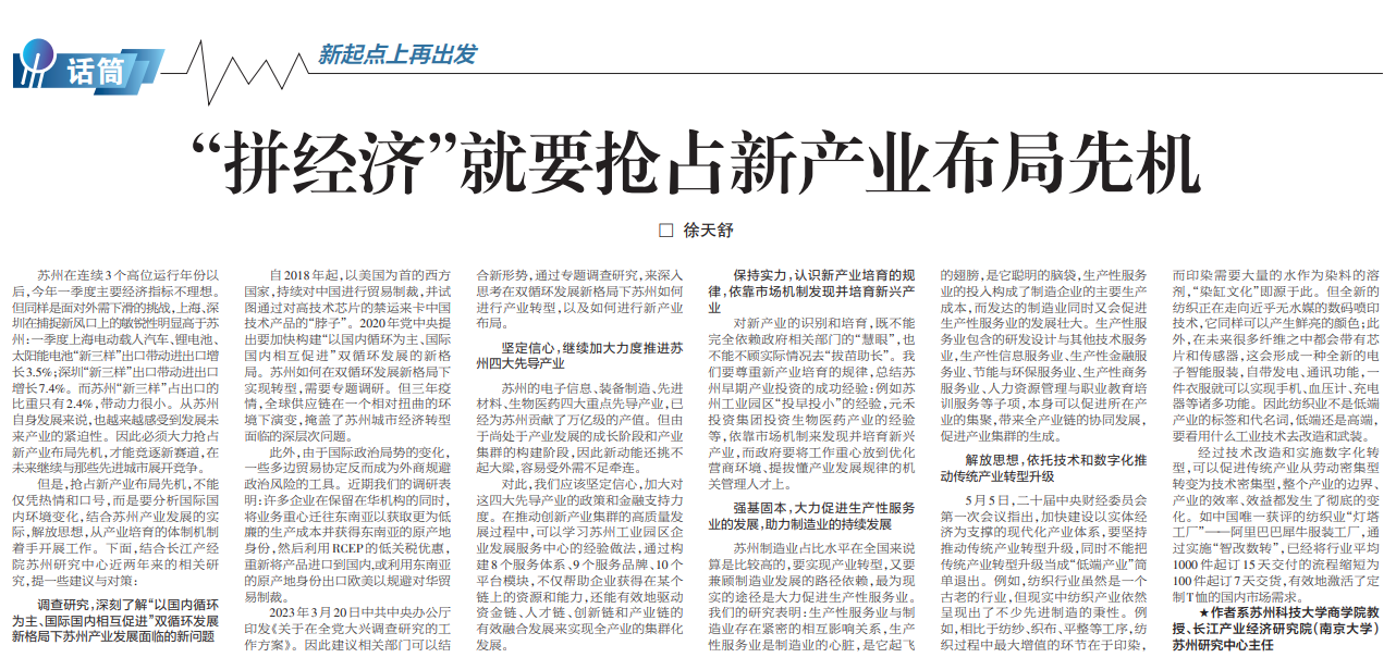就抢占新产业布局先机,具体应当如何做?苏州日报“思想+”理论月刊进行了专家约稿。公司beat365亚洲体育官方网站徐天舒教授撰写的“‘拼经济’就要抢占新产业布局先机”署名文章于5月30日在苏州日报B01版“思想+”理论月刊刊出。